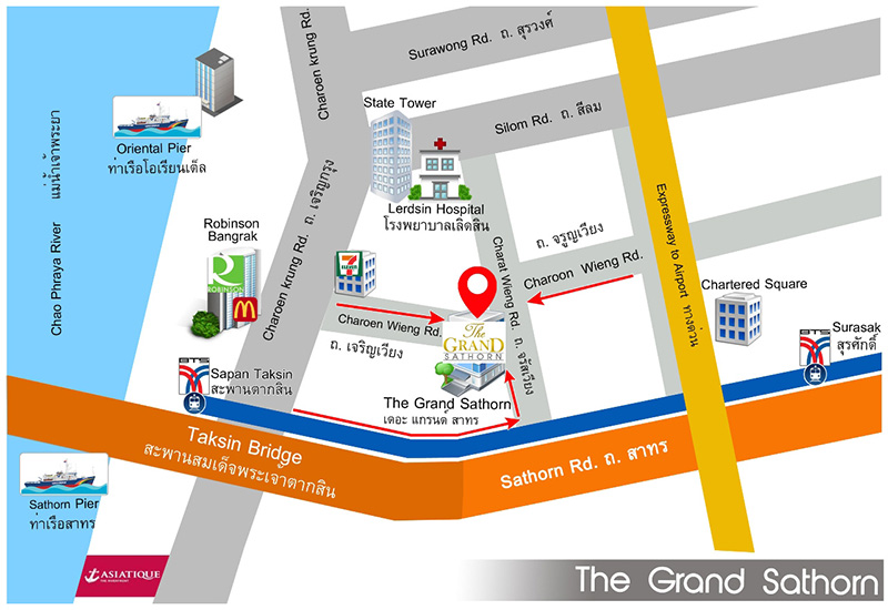 Robison Department Store Top Supermarket ,Bangrak Bazaar shopping area and entertainments areas of Bangkok. The hotel is within reach of Sathorn and Silom road, just only 5-7 minutes in walking distance from Taksin BTS station or Surasak BTS station, and a few minutes away from expressway and the Sathorn Chao Phraya River Pier.